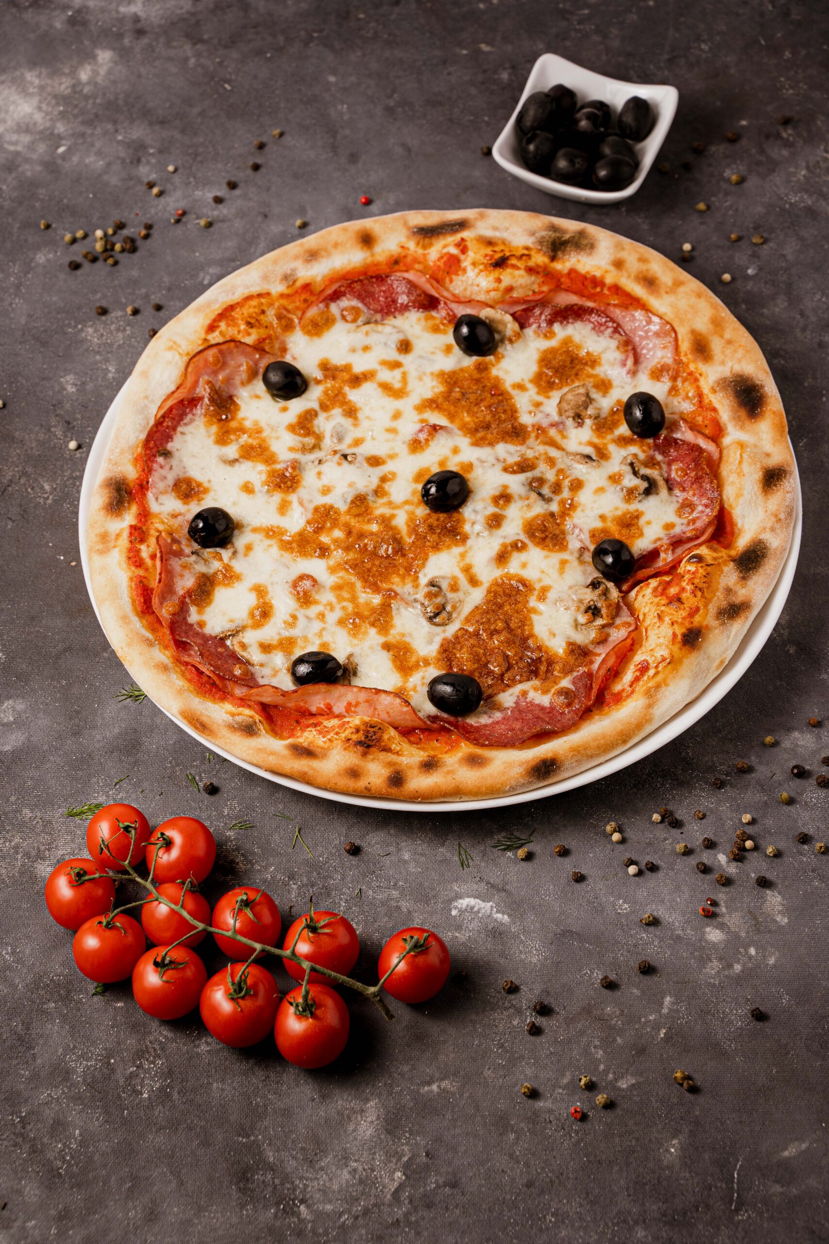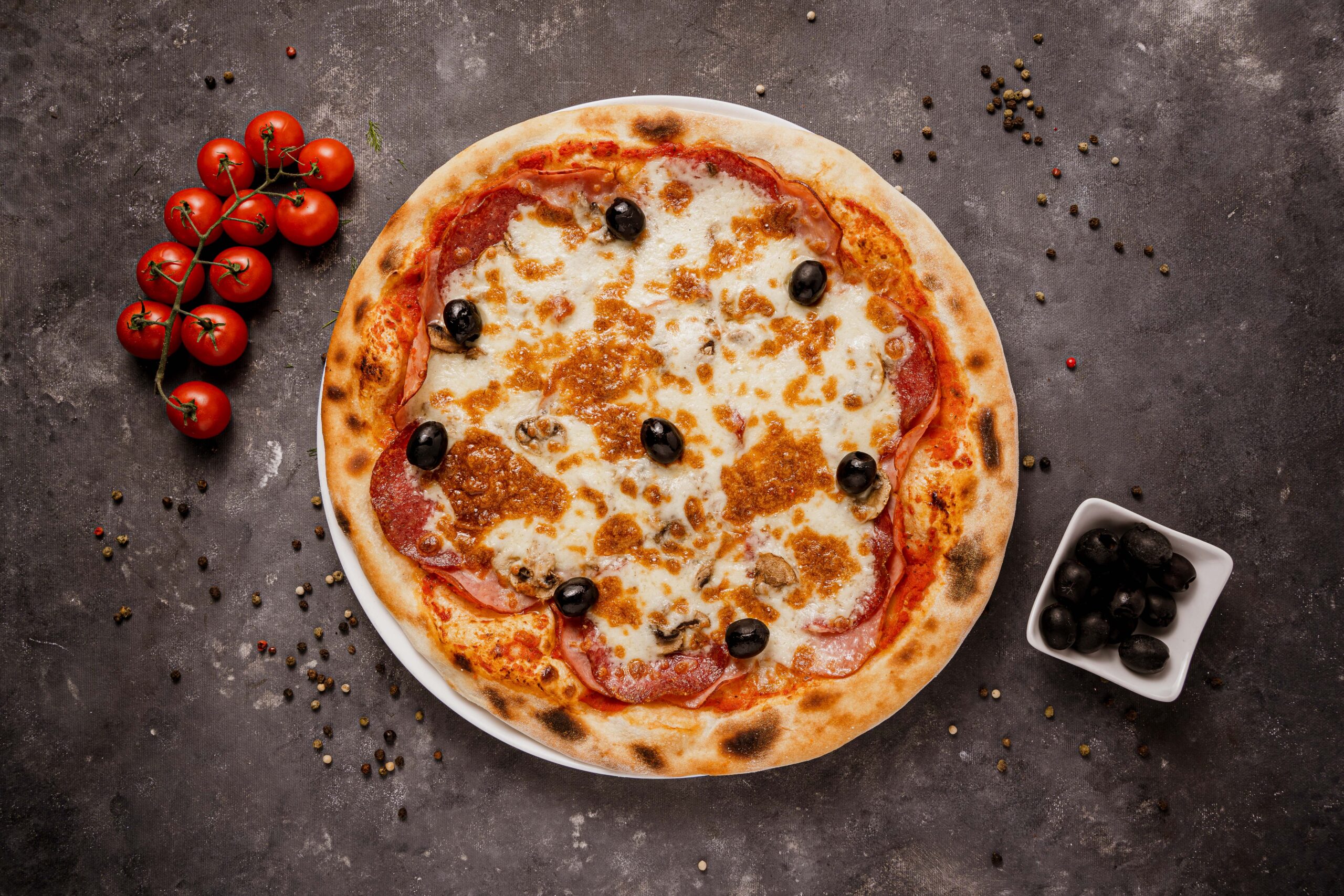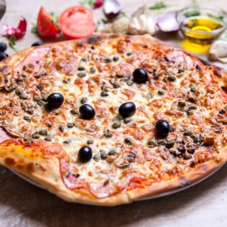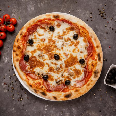 Sos de roșii, mozzarella, șuncă, salam, ciuperci, măsline.