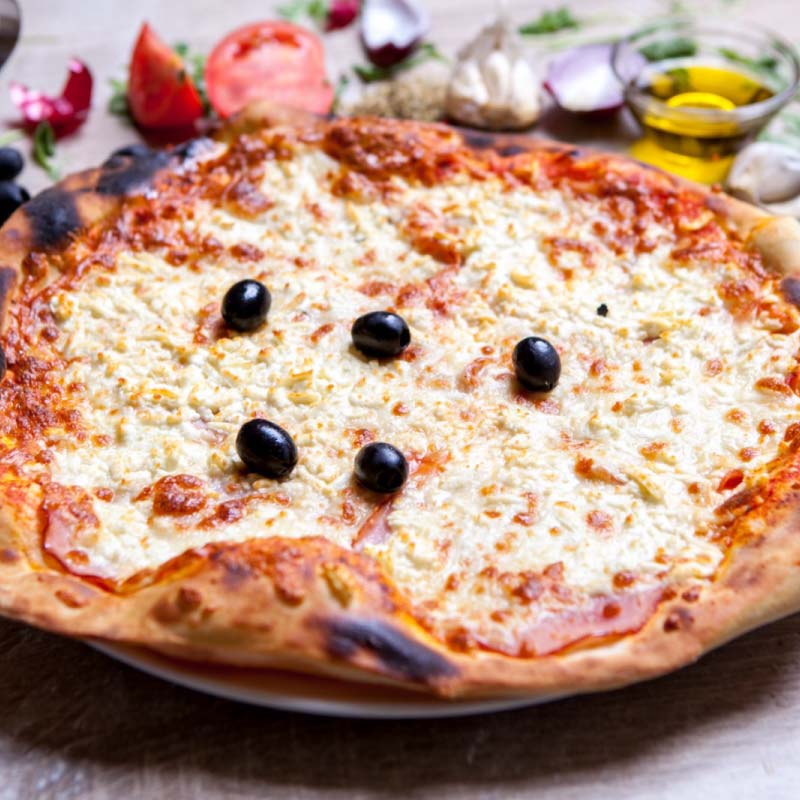 Sos de roșii, mozzarella, șuncă Praga, telemea, măsline.